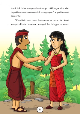 kami tak bisa menyembuhkannya. Akhirnya aku dan bapakku memutuskan untuk mengungsi,” si gadis mulai bercerita. “Kami tak tahu arah dan masuk ke hutan ini. Kami sempat dikejar kawanan monyet liar hingga tersesat. 31 31