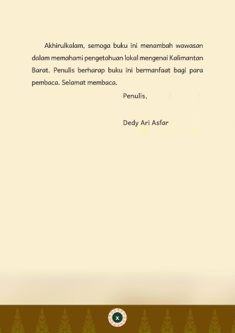 Akhirulkalam, semoga buku ini menambah wawasan dalam memahami pengetahuan lokal mengenai Kalimantan Barat. Penulis berharap buku ini bermanfaat bagi para pembaca. Selamat membaca. Penulis, Dedy Ari Asfar x