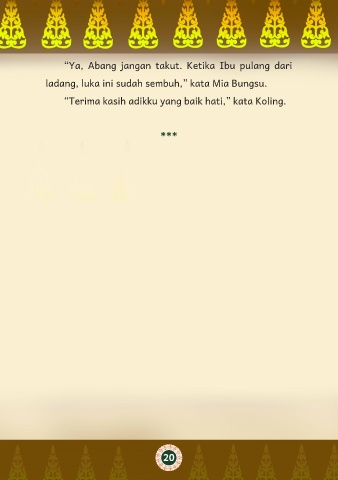 “Ya, Abang jangan takut. Ketika Ibu pulang dari ladang, luka ini sudah sembuh,” kata Mia Bungsu. “Terima kasih adikku yang baik hati,” kata Koling. *** 20