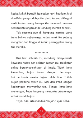 “Ayo, Kak, kita mandi air hujan,” ajak Peba.