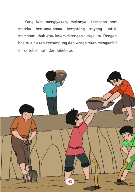Yang lain mengiyakan, makanya, keesokan hari mereka bersama-sama bergotong royong untuk membuat lubuk atau kolam di tengah sungai itu. Dengan begitu air akan tertampung dan warga akan mengambil air untuk minum dari lubuk itu. 41