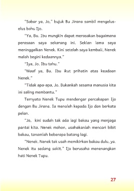 “Sabar ya, Jo,” bujuk Bu Jirana sambil mengelus-