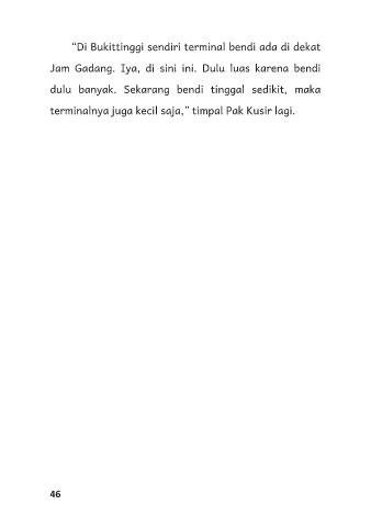 “Di Bukittinggi sendiri terminal bendi ada di dekat Jam Gadang. Iya, di sini ini. Dulu luas karena bendi dulu banyak. Sekarang bendi tinggal sedikit, maka terminalnya juga kecil saja,” timpal Pak Kusir lagi. 46