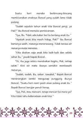 “Sudah, sudah, Bu, sabar, tawakal,” Bapak Boncel